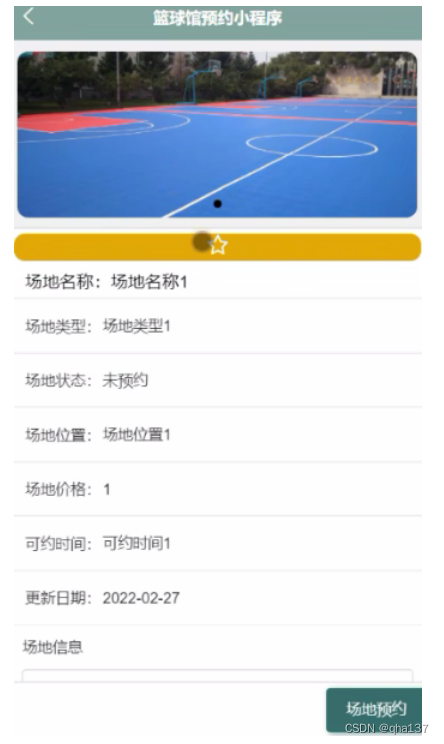 场地信息,在场地信息页面可以查看场地名称、场地类型、场地图片、场地状态、场地位置、场地价格、可约时间、更新日期等信息,如有需要进行场地预约或者收藏等操作,如图5-13所示。