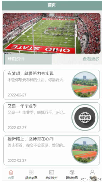 用户登陆小程序后,可以对首页、场地信息、培训专栏、器材信息、我的等功能进行详细操作,如图5-12所示。