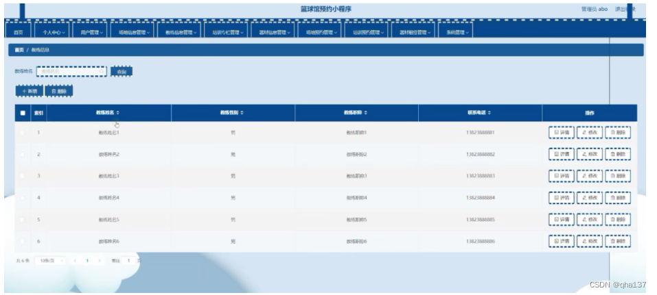 教练信息管理:在教练信息管理页面,可以对教练姓名、教练性别、教练职称、联系电话等内容进行详情、修改、删除等操作,如图5-5所示: