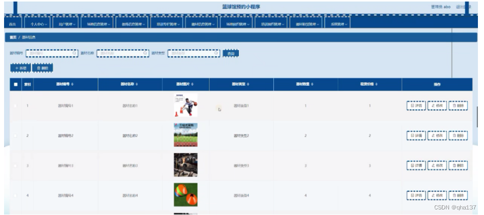 器材信息管理:在器材信息管理页面,可以查看器材编号、器材名称、器材图片、器材类型、器材数量、租赁价格等内容,还能进行详情、修改,删除,等操作,如图5-7所示: