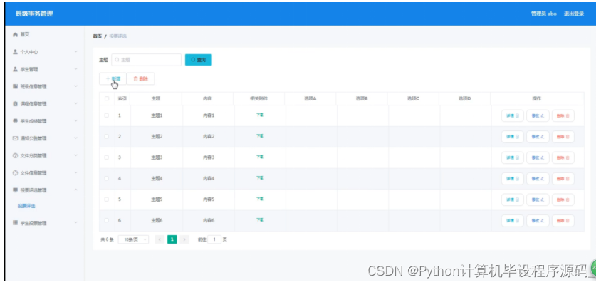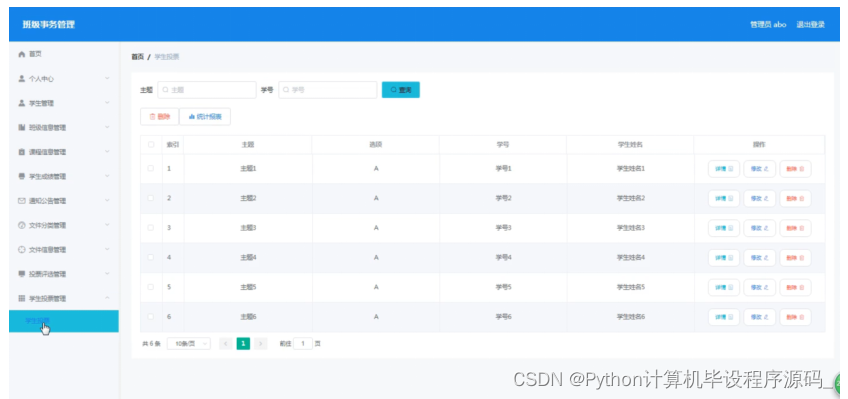 学生投票管理,在学生投票管理页面可以对索引、主题、选项、学号、学生姓名等内容进行详情、修改或删除等操作,如图5-10所示。