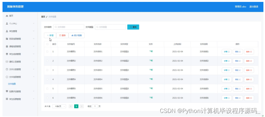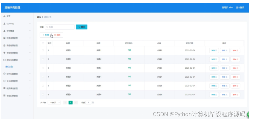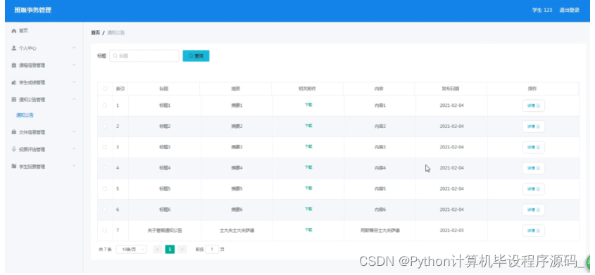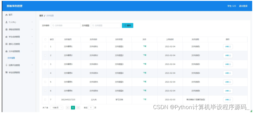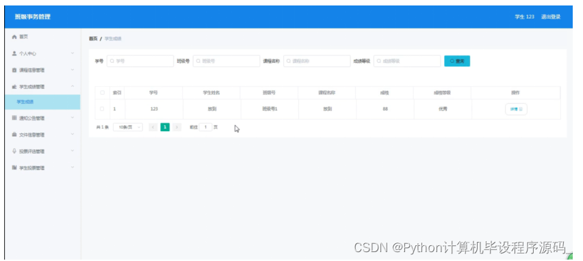 该文章描述了一个基于Python-Django框架的班级事务管理系统,包括管理员和学生的功能模块。管理员可管理学生、班级、课程、成绩、通知公告、文件和投票,而学生则能查看和管理个人信息、课程、成绩、通知和文件。系统提供了详细的界面截图和操作说明。