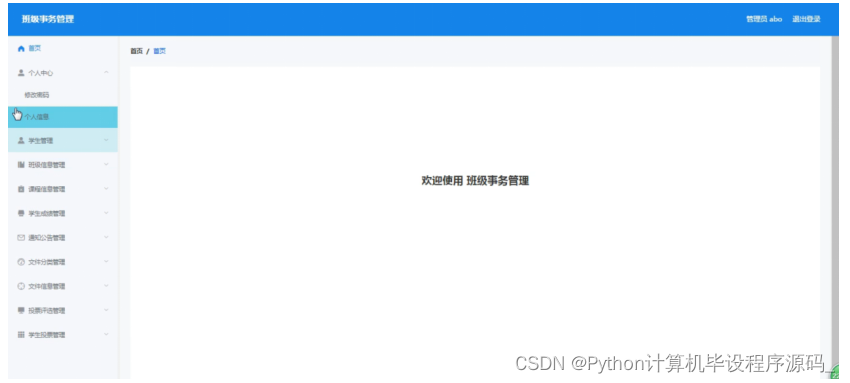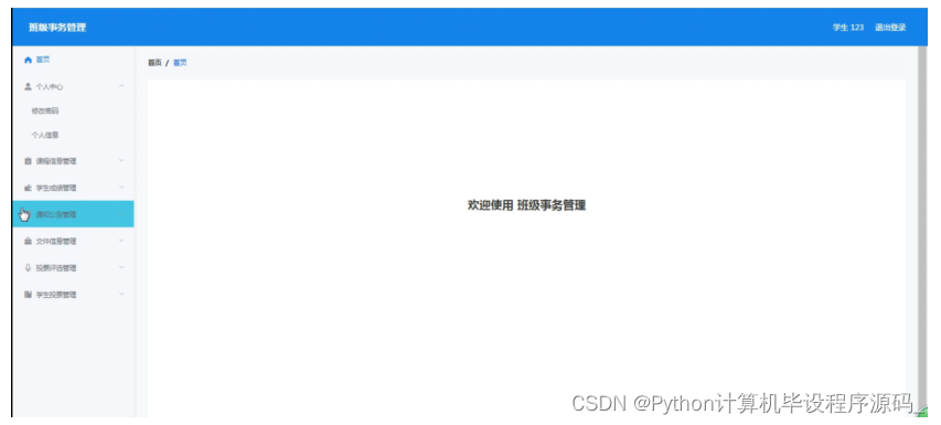 学生登录进入班级事务管理系统,可以对首页、个人中心、课程信息管理、学生成绩管理、通知公告管理、文件信息管理、投票评选管理、学生投票管理等功能进行相应操作,如图5-11所示。
