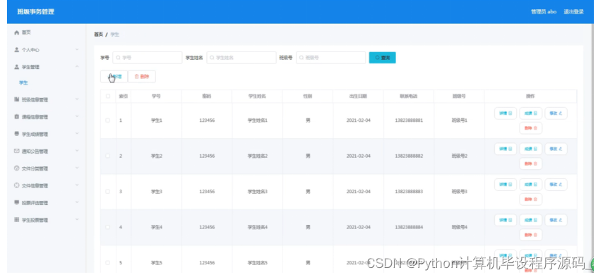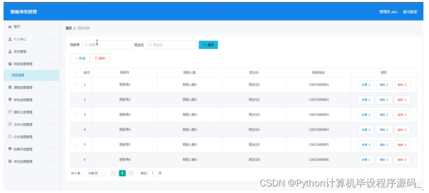 班级信息管理,在班级信息管理页面可以对索引、班级号、班级人数、班主任、联系电话等内容进行详情、修改或删除等操作,如图5-4所示。
