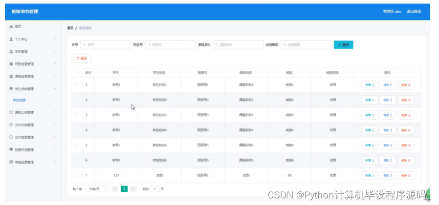 学生成绩管理,在学生成绩管理页面可以对索引、学号、学生姓名、班级号、课程名称、成绩、成绩等级等内容进行详情、修改或删除等操作,如图5-6所示。