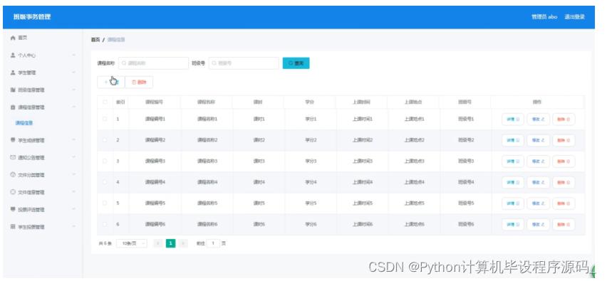 课程信息管理,在课程信息管理页面可以对索引、课程编号、课程名称、课时、学分、上课时间、上课地点、班级号等内容进行详情、修改或删除等操作,如图5-5所示。
