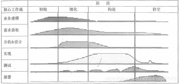 ②纵向为工作流:业务建模、需求获取、分析与设计、实现、测试、部署