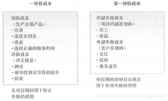 概念:为了达到产品或服务质量而进行的全部工作所发生的所有成本,包括一致性成本(即为确保与要求一致而做的所有工作)和不一致性成本(即由于不符合要求所引起的全部工作)