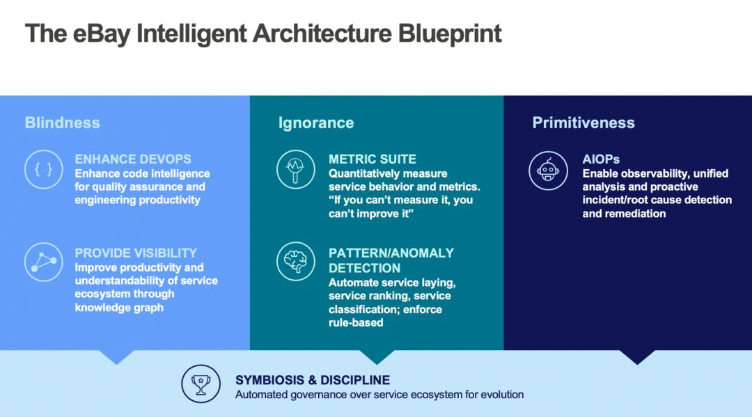 eBay 的愿景(被称为 INAR,智能架构)是通过提供自动化的可见性、评估和治理智能(Governance Intelligence)来构建可持续的服务架构。为此,我们开发了一种新的方法,使用知识图谱对应用程序生态系统进行建模和处理。