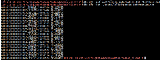 hdfs dfs -put /opt/person_information.txt /testBulkload可使用下面命令查看一下