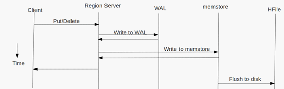 • client 端写入操作实际上都是 RPC 请求,数据传到 Region Server 中,默认首先会写入到 WAL(Write Ahead Log)中,也就是 HLog 中,然后才将数据写入到对应 region 的 memStore 中,memStore 满了之后,flush 到 HFile 中,这种情况的 flush 操作会引起瞬间堵塞用户的写操作。