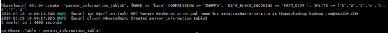 create 'person_information_table', {NAME => 'base',COMPRESSION => 'SNAPPY', DATA_BLOCK_ENCODING => 'FAST_DIFF'},SPLITS => \['1','2','3','4','5','6','7','8'\]