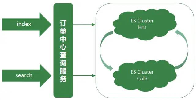 每次业务操作需要写入ES数据时,同步的写入主集群数据,然后异步的写入备集群数据。同时由于大部分ES查询的流量都来源于近几天的订单,且订单中心数据库数据已有一套归档机制,将指定天数之前已经关闭的订单转移到历史订单库。