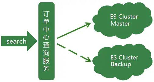 到此,订单中心的ES集群已经初具规模,但由于订单中心业务时效性要求高,对于ES查询稳定性要求也高,如果集群中有节点发生异常,查询服务会受到影响,从而影响到整个订单生产流程。显而易见这种异常情况是致命,所以为了应对这种情况,我们初步设想是增加一个备用集群,当主集群发生异常时,可以实时的将查询流量降级到备用集群。