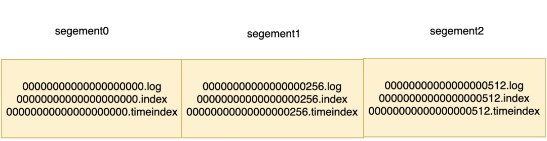 示例中第 2 个 LogSegment 对应的基准位移是 256,也说明了该 LogSegment 中的第一条消息的偏移量为 256,同时可以反映出第一个 LogSegment 中共有 256 条消息(偏移量从 0 至 254 的消息)。