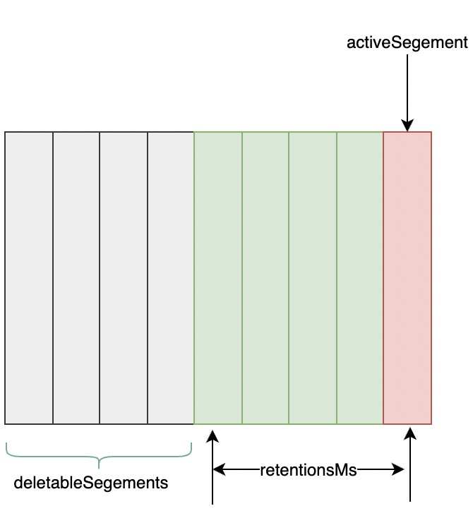 日志删除任务会检查当前日志文件中是否有保留时间超过设定的阈值(retentionMs)来寻找可删除的日志分段文件集合(deletableSegments),如图下图所示。retentionMs 可以通过 broker 端参数 log.retention.hours、log.retention.minutes 和 log.retention.ms 来配置,其中 log.retention.ms 的优先级最高,log.retention.minutes 次之,log.retention.hours 最低。默认情况下只配置了 log.retention.hours 参数,其值为 168,故默认情况下日志分段文件的保留时间为 7 天。