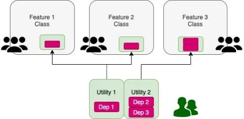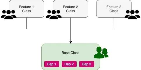 这种方法有很多收益,特性团队无需自己实现通用代码就可以享受它带来的种种好处。以上面这张简图所示,依赖项 1、2 和 3 都被注入到基类中,这样特性类都可以获得它们而无需额外成本。