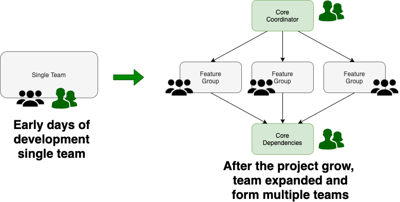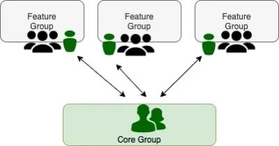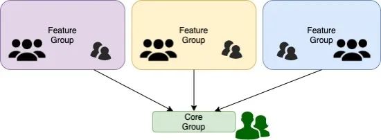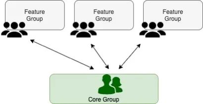 回想一下你刚开始开发的时候,那时完全用不着什么核心团队,因为一个团队就可以搞定所有事情了。然而,随着时间的推移,团队也在不断壮大。我们现在需要更细致地分配工作,让一些团队负责特性交付,一些团队负责公共代码,如下所示。