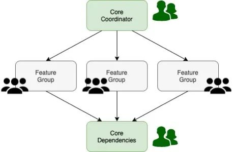 但我们确实有一些名字听起来更专业的团队,比如基础设施团队、架构团队、核心团队,等等——这些名字听起来都很迷人。这种团队负责处理所用应用程序的核心主体,如下图中的核心协调/依赖项小组示例所示。