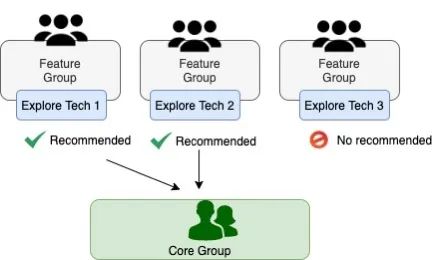 这种自由很棒,因为它可以跨团队进行可扩展的探索活动。并非所有新学到的技术都应该被采用。从特性团队中吸取的教训可以帮助组织过滤掉不适合的技术。那些表现很出色的技术可以推荐给核心团队,后者可以考虑让其他团队也采用它。