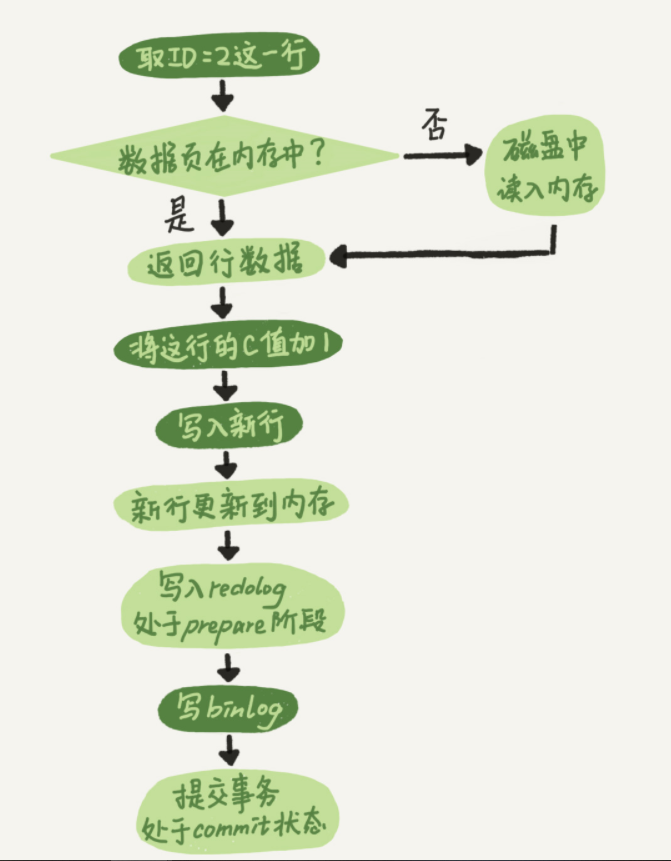 结合着我们今天的更新语句来说的话,当有一条记录需要更新的时候,InnoDB 引擎就会先把记录写到 redo log(粉板)里面,并更新内存,这个时候更新就算完成了。同时,InnoDB 引擎会在适当的时候,将这个操作记录更新到磁盘里面,而这个更新往往是在系统比较空闲的时候做,这就像打烊以后掌柜做的事。