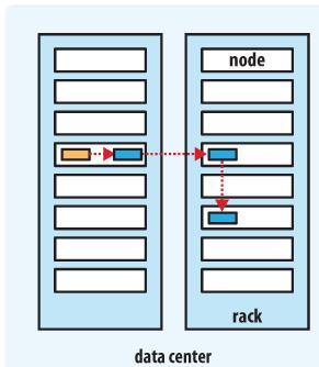 在分布式集群下,由于机架的的槽位和交换机网口数量的限制,使得集群上的机器不得不跨越机架,通常一个大型的集群会跨越很多机架。一般情况机架内机器的通讯会快于跨机架机器之间的通讯,并且机架之间机器的网络通信通常受到上层交换机间网络带宽的限制。