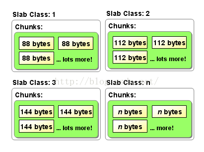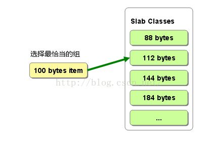 Memcached根据收到的数据的大小,选择最适合数据大小的Slab(如下图)。 Memcached中保存着slab内空闲chunk的列表,根据该列表选择chunk,然后将数据缓存于其中。