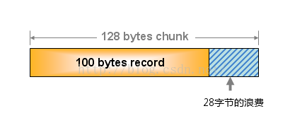 将100字节的数据缓存到128字节的chunk中,剩余的28字节就浪费了(如下图):