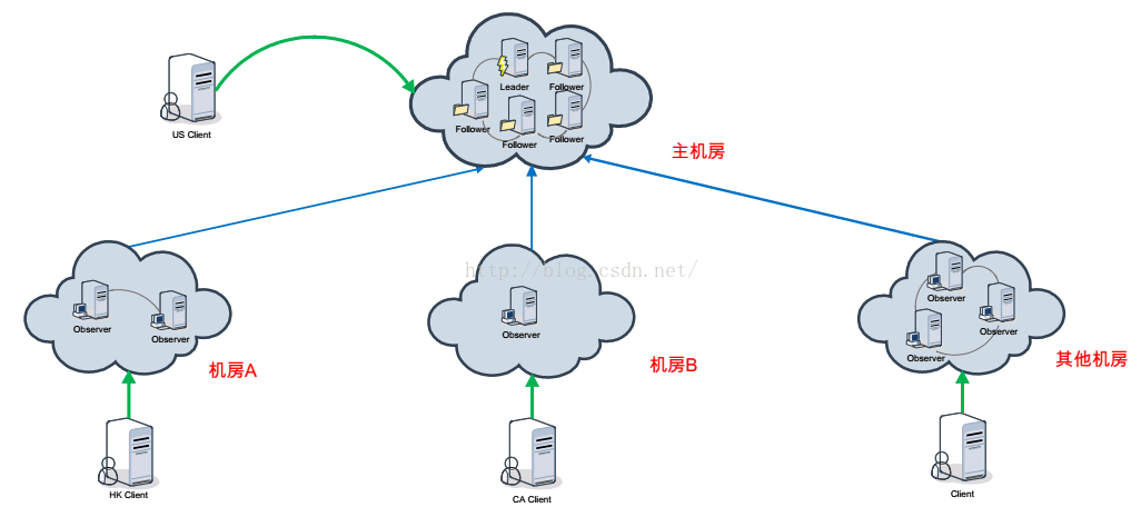 Observer有另外一个优势,因为它不参与投票,所以他们不属于Zookeeper集群的关键部位,即使他们Failed,或者从集群中断开,也不会影响集群的可用性。根据Observer的特点,我们可以使用Observer做跨数据中心部署。如果把Leader和Follower分散到多个数据中心的话,因为数据中心之间的网络的延迟,势必会导致集群性能的大幅度下降。使用Observer的话,将Observer跨机房部署,而Leader和Follower部署在单独的数据中心,这样更新操作会在同一个数据中心来处理,并将数据发送的其他数据中心(包含Observer的),然后Client就可以在其他数据中心查询数据了。但是使用了Observer并非就能完全消除数据中心之间的延迟,因为Observer还得接收Leader的同步结果合Observer有更新请求也必须转发到Leader,所以在网络延迟很大的情况下还是会有影响的,它的优势就为了本地读请求的快速响应。