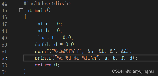 - 如果要强制跳过字符前的空⽩字符,可以写成 scanf(" %c", &ch) ,即 %c 前加上⼀个空格,表⽰跳过零个或多个空⽩字符。