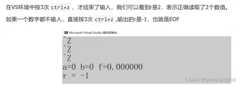 scanf() 的返回值是⼀个整数,表⽰成功读取的变量个数。 如果没有读取任何项,或者匹配失败,则返回 0 。如果在成功读取任何数据之前,发⽣了读取错误或 者遇到读取到⽂件结尾,则返回常量 EOF。