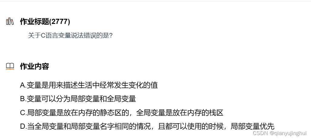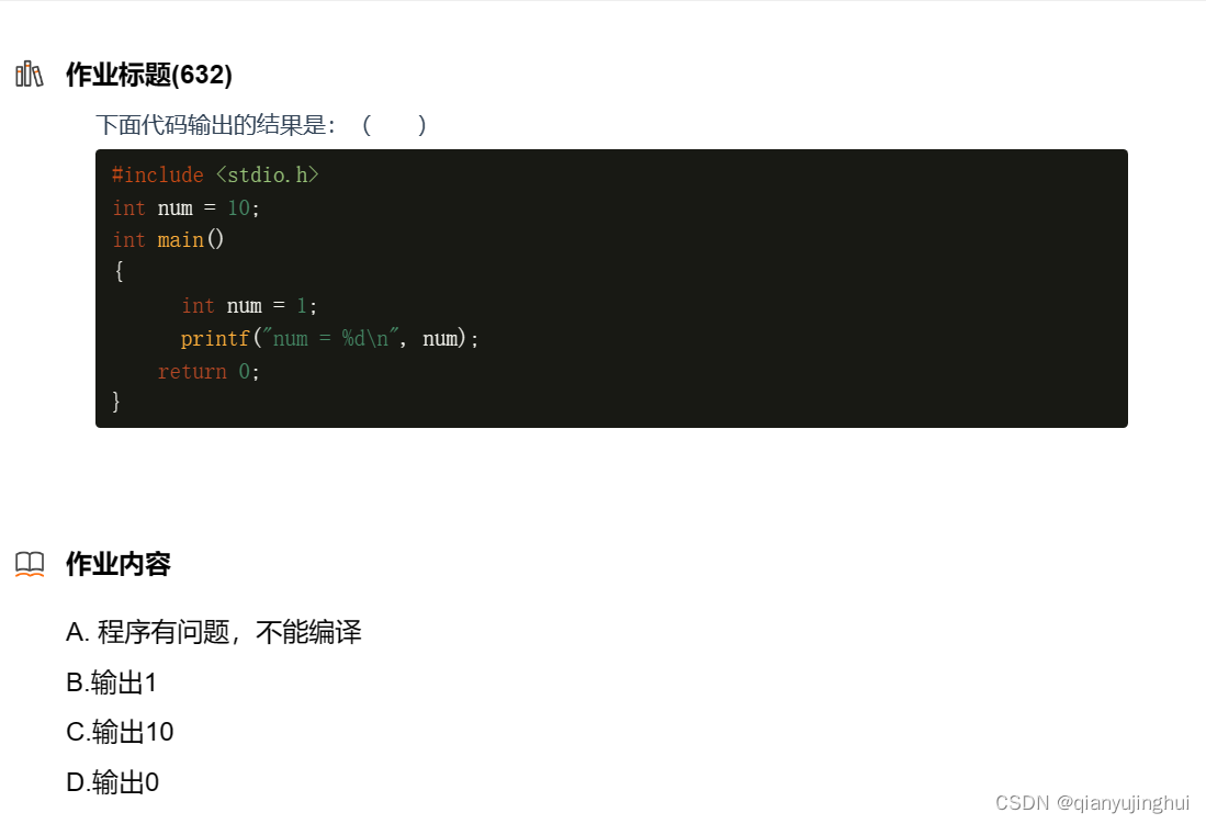 B:正确,main中访问的是main中的num,而main函数中的num是1,因此打印1