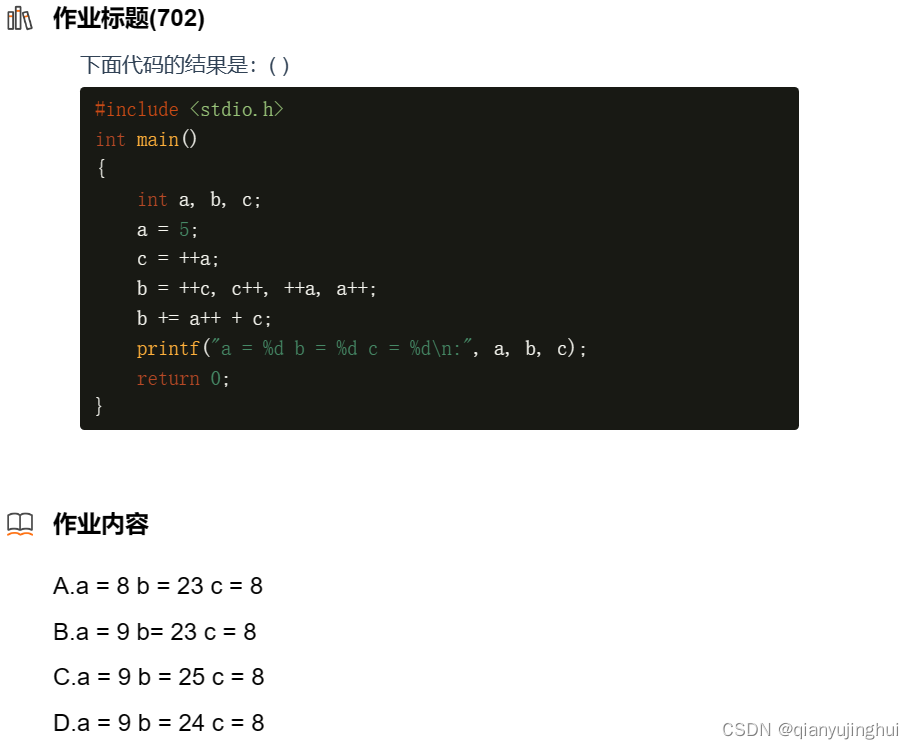#include <stdio.h> int main() { int a, b, c; a = 5; c = ++a;// ++a:加给a+1,结果为6,用加完之后的结果给c赋值,因此:a = 6 c = 6 b = ++c, c++, ++a, a++; // 逗号表达式的优先级,最低,这里先算b=++c, b得到的是++c后的结果,b是7 // b=++c 和后边的构成逗号表达式,依次从左向右计算的。 // 表达式结束时,c++和,++a,a++会给a+2,给c加1,此时c:8,a:8,b:7 b += a++ + c; // a先和c加,结果为16,在加上b的值7,比的结果为23,最后给a加1,a的值为9 printf("a = %d b = %d c = %d\n:", a, b, c); // a:9, b:23, c:8 return 0; }