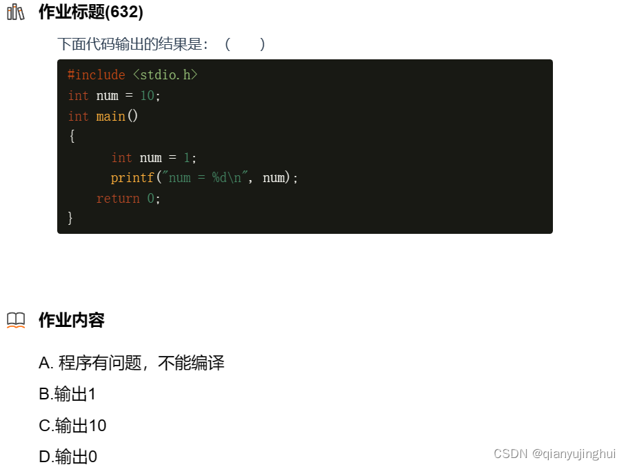 B:正确,main中访问的是main中的num,而main函数中的num是1,因此打印1