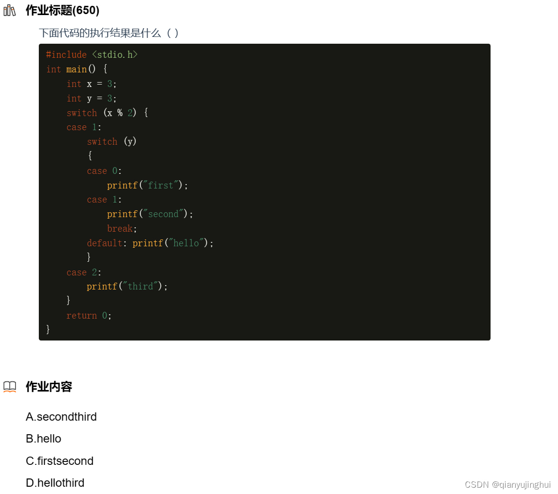 #include <stdio.h> int main() { int x = 3; int y = 3; switch (x % 2) { // x%2的结果为1,因此执行case1 case 1: switch (y) // y是3,因此会执行case3,而case3不存在,那只能执行default { case 0: printf("first"); case 1: printf("second"); break; default: printf("hello"); // 打印hello,打印完之后,内部switch结束,此时外部case1结束 } // 因为外部case1之后没有添加break语句,所以继续执行case2 case 2: // 打印third printf("third"); // 外部switch结束 } return 0; }