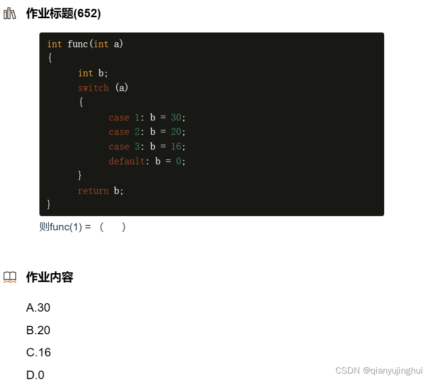 - func(1)可知,在调用func时形参a的值为1,switch(a)<==>switch(1),case 1被命中,因为该switch语句中所有分支下都没有增加break语句,因此会从上往下顺序执行,最后执行default中语句返回。