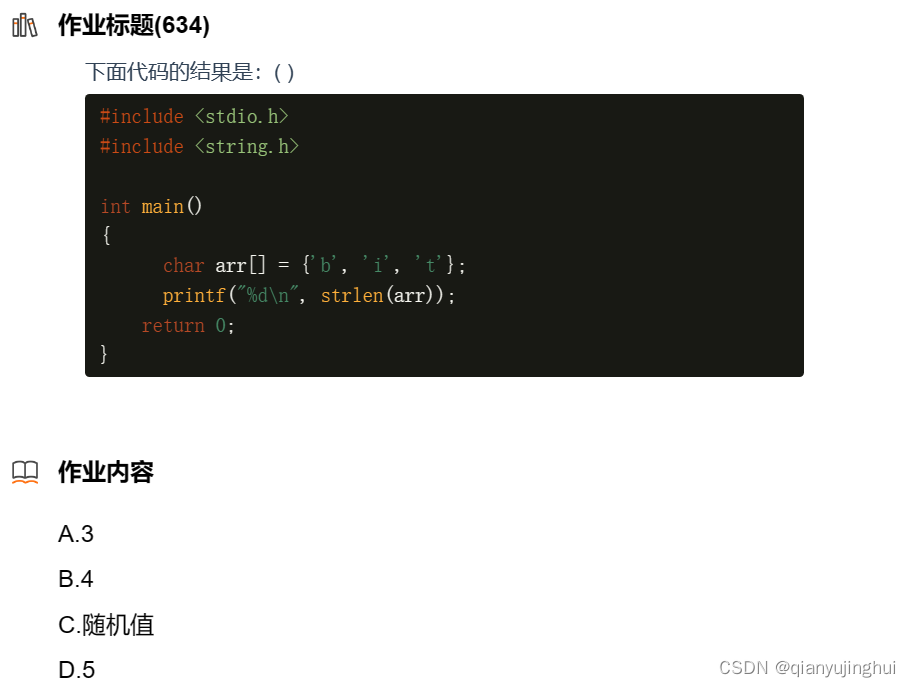 - strlen是用来获取字符串的有效长度的,结尾标记'\0'不包含在内,strlen获取的规则非常简单:从前往后依次检测,直到遇到'\0'是就终止检测,题中代码没有"\0",所以输出是随机值。