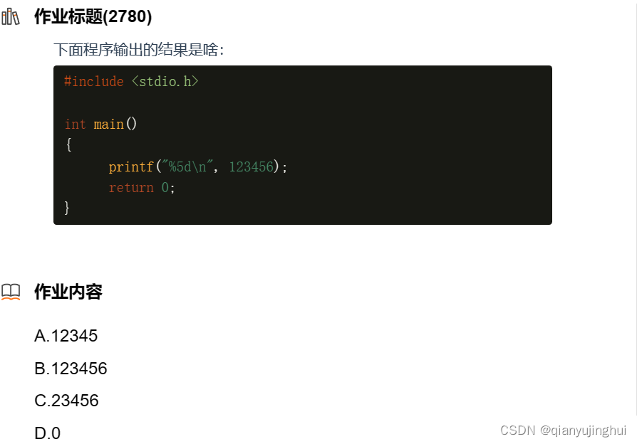 printf()允许限定占位符的最小宽度。%5d表示这个占位符的宽度至少为5位。如果不满5位,对应的值的前面会添加空格。如果超过5位,正常输出就行,5是最少输出5位。