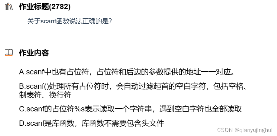 - B:scanf()处理数值占位符时,会自动过滤空白字符,包括空格、制表符、换行符,scanf输出字符占位符的时候,不忽略空白字符,总是返回当前第一个字符,无论该字符是否为空格。