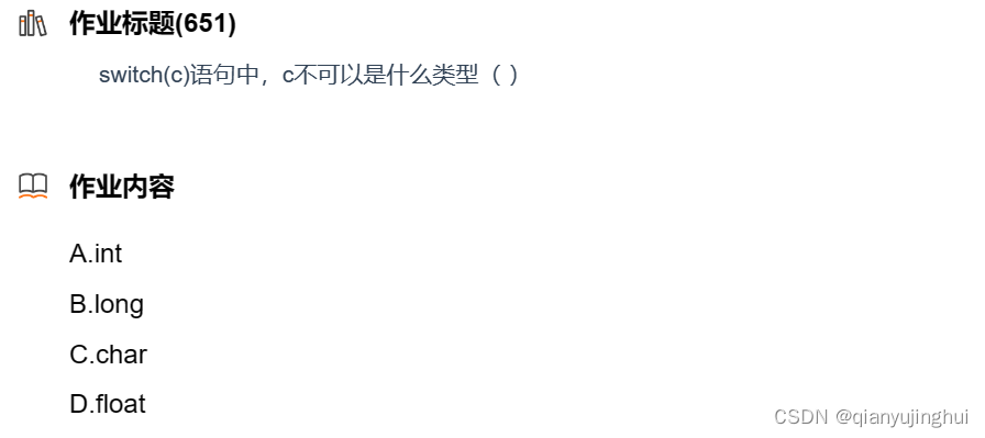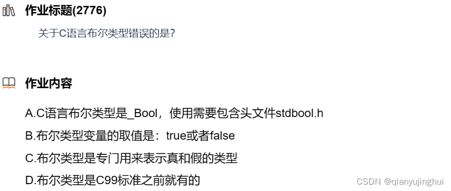 - 然而,在C99标准中引入了新的布尔类型(stdbool.h头文件),定义了bool类型和true/false常量。布尔类型只有两个取值:true和false,用于表示真和假。