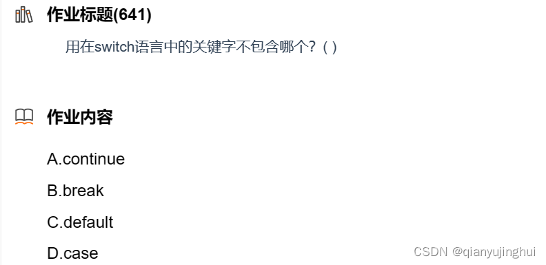- continue是用来结束本次循环的,而switch不是循环,因此其中不能使用continue关键字。