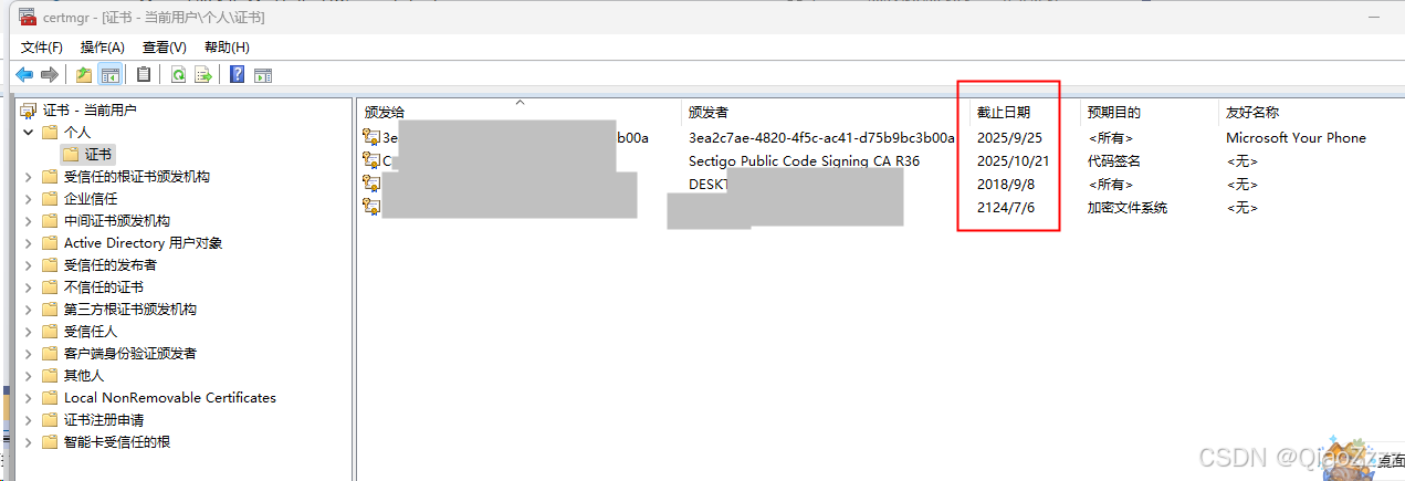 - 可以通过以下方式查看:cmd打开命令行,输入certmgr,打开下图中的证书,查看截止如期。如果过期了就右键删除。