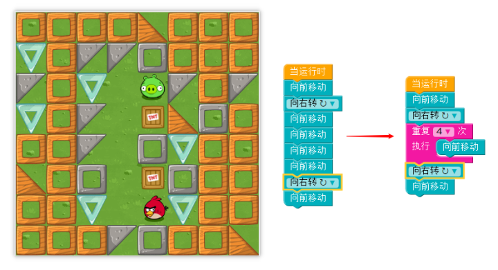 在左边的代码中存在4个连续的“向前移动”,如果存在重复的指令,可以使用右边的“重复执行”积木来实现。