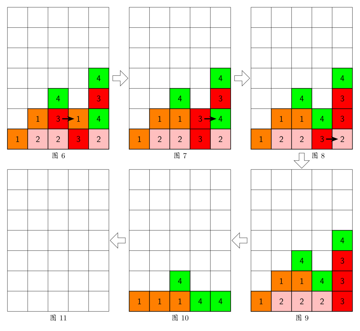 - 每步移动可以且仅可以沿横向(即向左或向右)拖动某一方块一格:当拖动这一方块时,如果拖动后到达的位置(以下称目标位置)也有方块,那么这两个方块将交换位置(参见输入输出样例说明中的图 6 6 6 到图 7 7 7);如果目标位置上没有方块,那么被拖动的方块将从原来的竖列中抽出,并从目标位置上掉落(直到不悬空,参见下面图 1 1 1 和图 2 2 2);