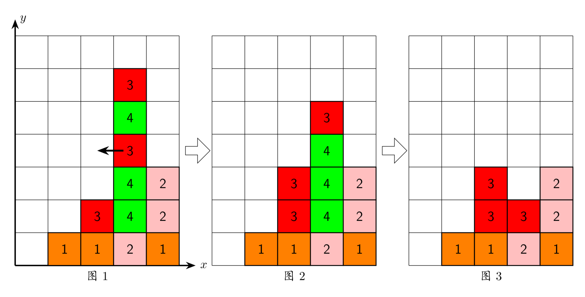 样例输入的游戏局面如上面第一个图片所示,依次移动的三步是: ( 2 , 1 ) (2,1) (2,1) 处的方格向右移动, ( 3 , 1 ) (3,1) (3,1) 处的方格向右移动, ( 3 , 0 ) (3,0) (3,0) 处的方格向右移动,最后可以将棋盘上所有方块消除。