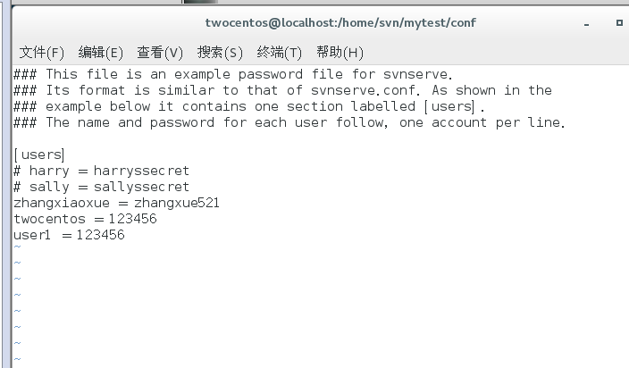 svnserve.conf: 版本库配置文件,在末尾追加下面内容