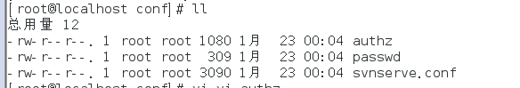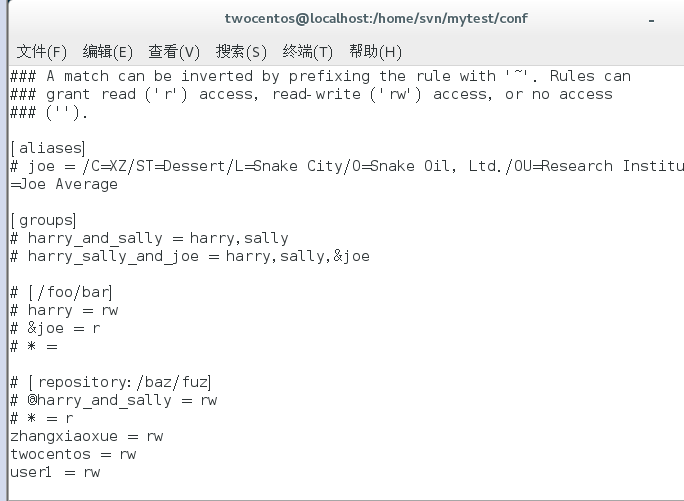 authz:用户权限配置,在末尾追加用户名和权限,如图所示(列出对各用户的授权。包括只读r,读写rw。没有列出的用户,则不允许访问)