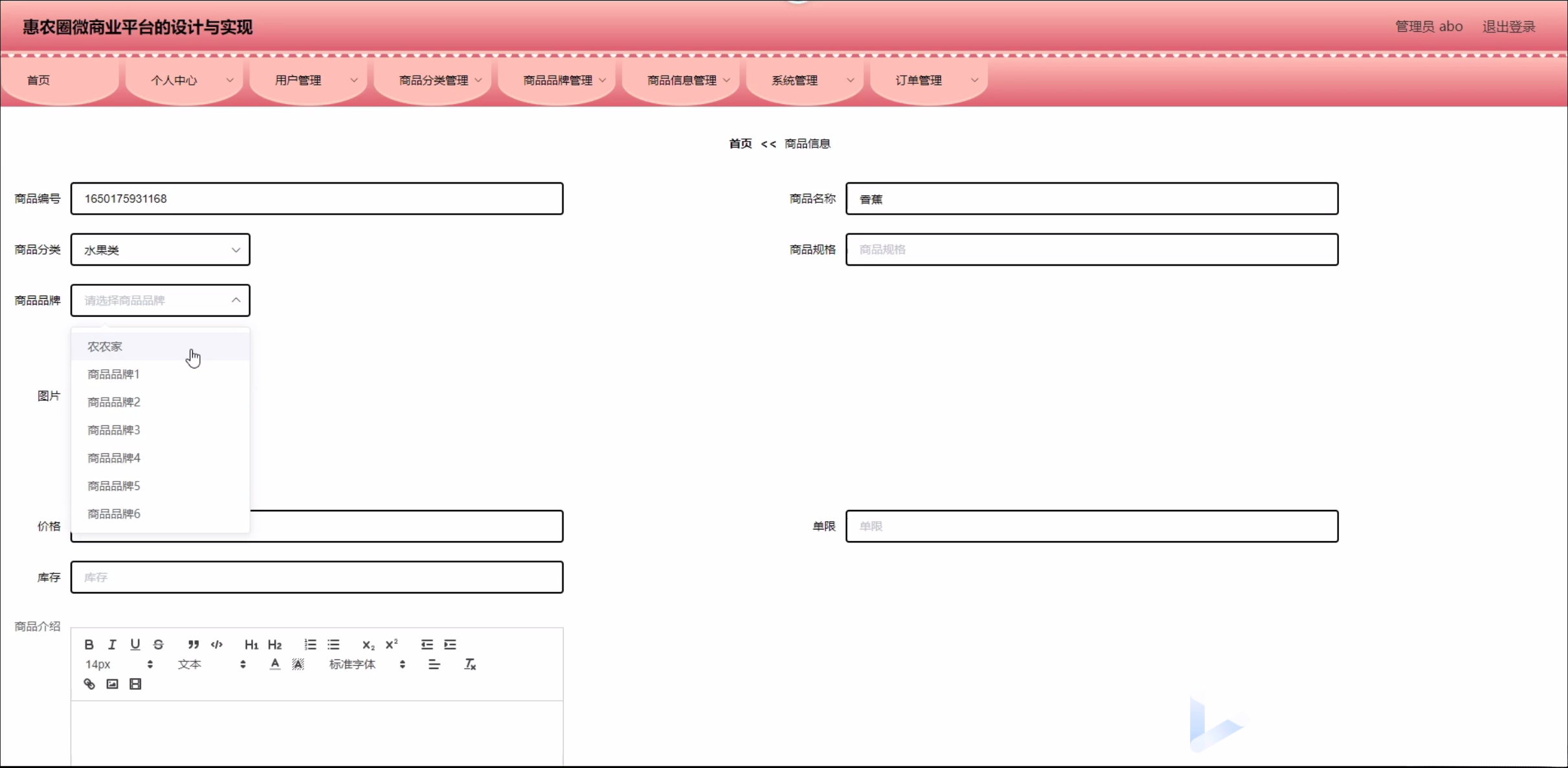 惠农圈微商业平台的设计与实现正是基于这一背景展开的。该平台旨在为农民提供一个便捷、实用的电子商务服务平台,帮助他们更好地开展农产品销售、获取农业信息、学习农业技术等。通过该平台,农民可以更加方便地将自家的农产品销售到全国各地,提高农产品的附加值,从而增加农民的收入。同时,该平台还可以为农民提供丰富的农业信息和技术资源,帮助他们提高农业生产效率,实现农业现代化。