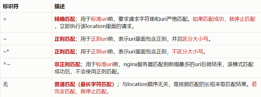 其中,方括号中的四种标识符是可选项,用来改变请求字符串和uri的匹配方式。uri是待匹配的请求字符串,可以是不包含正则的字符串,这种模式被称为“标准的uri";也可以包含正则,这种模式被称为"正则uri",如下: