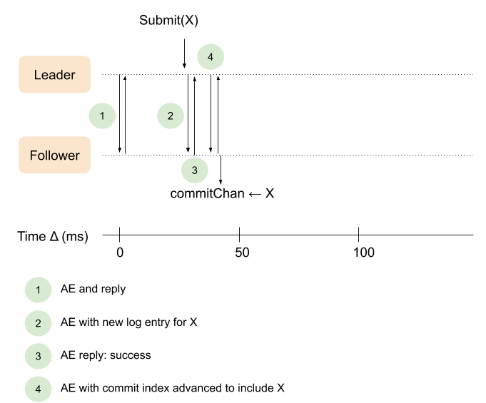 正如在第2部分中简要提到的,当前的领导者执行效率很低。领导者在 LeaderSendHeartbeats 中发送AE,定时器每隔50毫秒调用一次。假设提交了一条新命令;领导者将等到下一个50毫秒的边界,而不是立即通知跟随者。更糟的是,因为需要两次AE往返来通知跟随者命令已提交。如图: